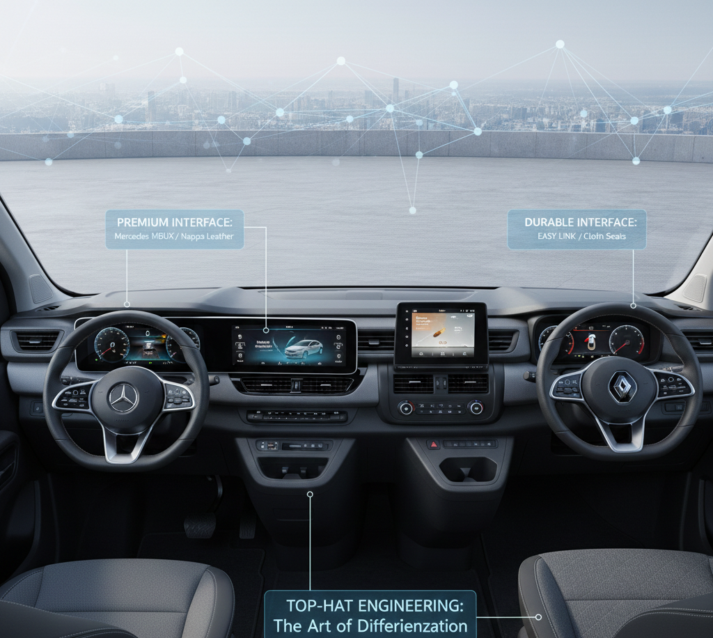 Besonders aufschlussreich sind die Drillinge Mercedes Citan / Renault Kangoo / Nissan Townstar, die alle im Renault-Werk in Maubeuge (Nordfrankreich) gebaut — auf der CMF-CD-Plattform der Renault-Nissan-Allianz. Mercedes hat für die T-Klasse (die PKW-Variante des Citan) das MBUX-Infotainment, hochwertigere Sitze und eine Mercedes-typische Innenraum-Anmutung hinzugefügt. Dennoch bleibt die Grundstruktur — Laderaum, Rückbank, Türen, Fahrwerk — identisch.