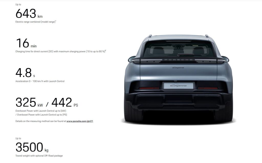 | Cayenne Turbo Electric | 630 kW (857 PS) / 850 kW (1.156 PS) mit LC | 2,5 s | 617–623 km | 165.500 € |