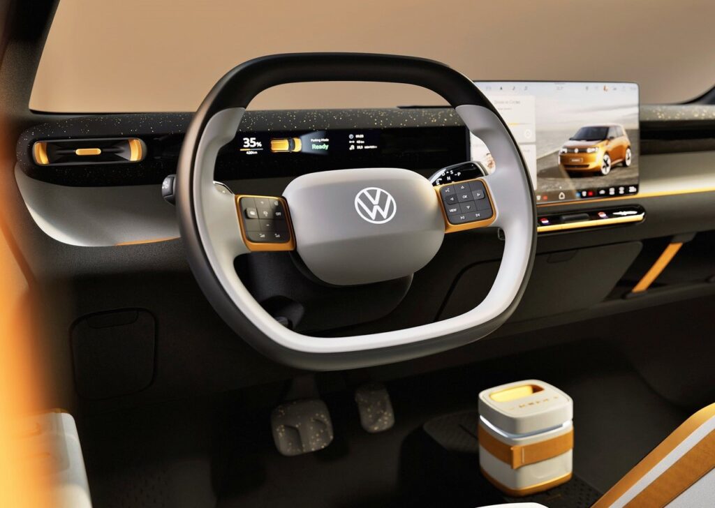 - Sympathie (Likeability): Das Design soll eine positive emotionale Verbindung herstellen und dir ein Lächeln ins Gesicht zaubern – erkennbar an der „lächelnden“ Front und dem „lächelnden“ Heck. Die Designsprache ist klar und ästhetisch ansprechend, auch im Innenraum. Warme, freundliche Farben und angenehme Oberflächen schaffen eine echte Wohlfühlatmosphäre. Ein Großteil der Stoffe im Innenraum besteht aus recycelten Materialien (ja, aus PET-Flaschen!), und eine neue, Terrazzo-ähnliche Oberfläche verleiht dem ID. EVERY1 einen leichten und modernen Look.