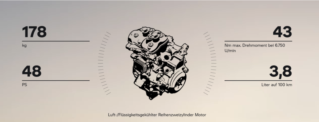 Die Leistungsdaten sind klar auf die A2-Klasse zugeschnitten: volle 48 PS bei 8.750 U/min, das Maximum dessen, was der A2-Führerschein erlaubt. Das Drehmoment von 43 Nm liegt bereits bei 6.750 U/min an. In Kombination mit dem niedrigen Gewicht ergibt sich ein Leistungsgewicht von 3,7 kg/PS — das ist im A2-Segment ein starker Wert.